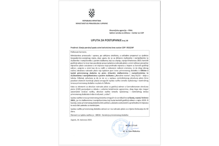 Po zahtjevu sindikata Vlada Republike Hrvatske dala je uputu da se službenicima i namještenicima u javnim službama privremeni dodatak na plaću isplaćuje u punom iznosu neovisno o korištenju godišnjeg odmora ili bolovanja do 42 dana.