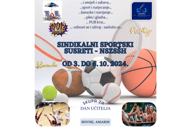 Poštovane/i, pozivamo vas na Sportske susrete Nezavisnog sindikata zaposlenih u srednjim školama Hrvatske koji će se održati u turističkom naselju Amarin **** u Rovinju 3. – 6. 10. 2024. godine.